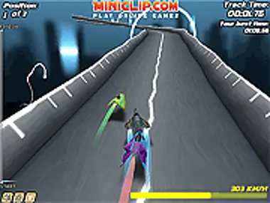 Race around the Wipeout-like track against AI hover cars. Hit speed boosts to ensure you stay in 1st